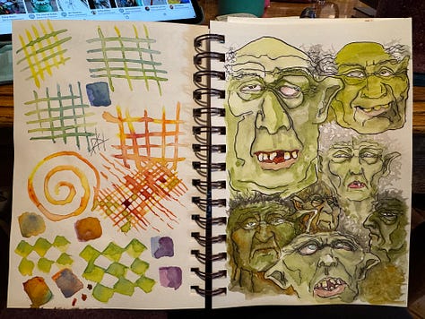 New to this “sub stacking”…. Been loving seeing how many folks out there love mark making of all sorts… my hope for 2025 is to begin to fill all the partially empty sketchbooks around me… some have been sitting idle for as long as 45 years! Having recently taken up water color again, a medium which allows one to leave brushes to dry without ruining them…. And gotten two fountain pens for myself… and discovered the vast online community of creatives… I intend to fill my elder years filling the back pages of my stack of old and new sketchbooks and posting some of it here.