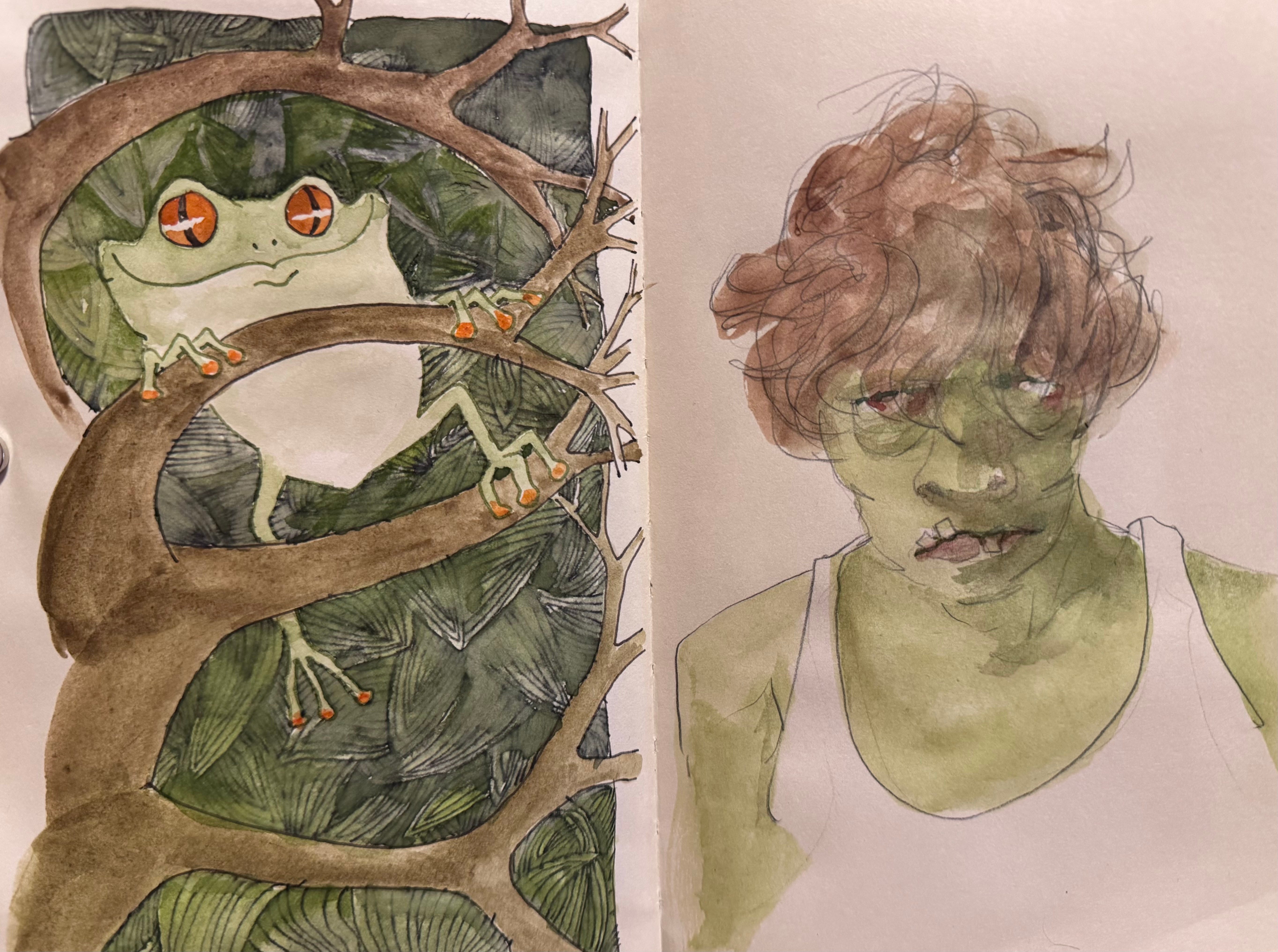 I drew the frog yesterday and the teenage zombie a couple of years ago. Family joke, teasing my groggy grandson about how he used to stagger out of bed all tangled up and looking, well, like a zombie. It was just a quick pencil sketch, but since I had the greens and browns mixed up for the frog,I figured I might as well green up the zombie boy as well.