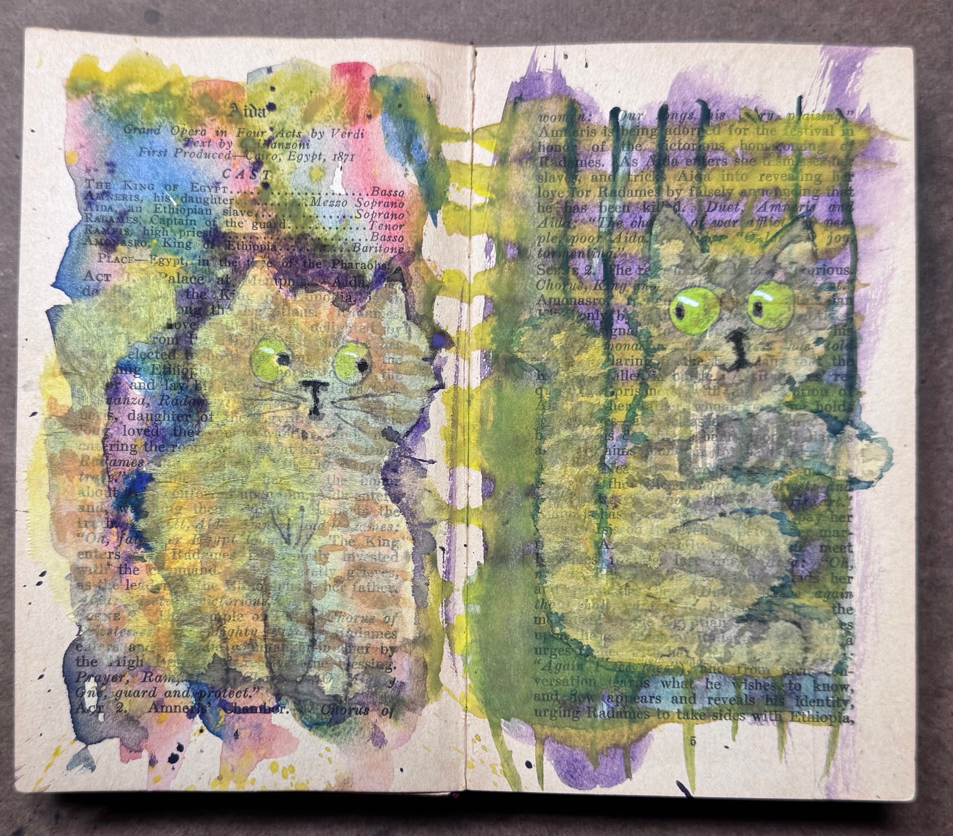 More operaThere are 200 pages… quite a challenge!Hue WalkerSep 22, 202544ShareThese two were made with tea bag tissue. A friend gave me this little hundred year old free book from a Chicago bank. 100 operas. My challenge is to fill it with whimsy.