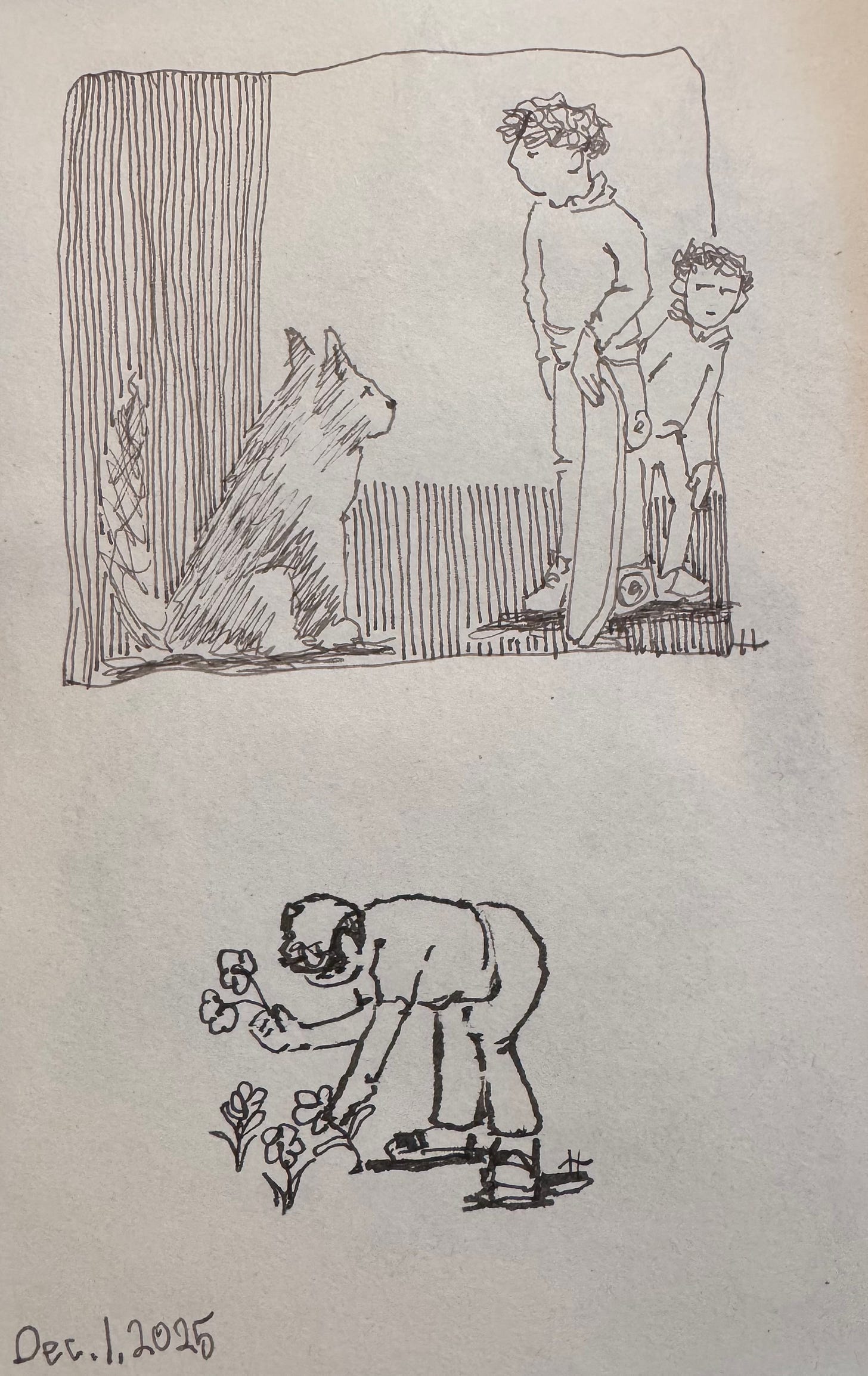 An older brother assessing the situation, and OK older brother assessing the situation that dog is dangerous, but it is sitting there still and its ears are up. It’s not growling, but the little guy is not quite the cure. They’re looking at each other. They’re like OK. What are we gonna do isn’t that someone like me picking flowerssomeone like me picking flowers.